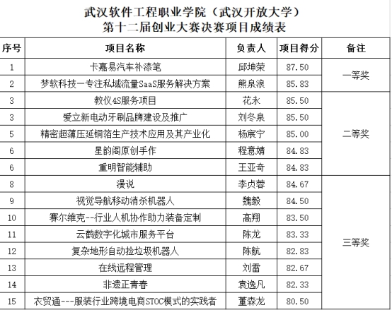 本届大赛以“服务人才培养、促进留汉创业”为主题,历时半年,通过各学院初赛、复赛,校排位赛三轮比拼,共产生15支团队参加决赛。本次比赛各团队需完成项目路演5分钟,答辩5分钟,取6位专家评委老师的平均成绩作为团队最后得分。经过激烈角逐,“卡嘉易汽车补漆笔”、“梦软科技—专注私域流量SaaS服务解决方案”两个项目获一等奖;“精密超薄压延铜箔生产技术应用及产业化”、“教仪4S服务项目”、“星韵阁原创手作”等五个项目获二等奖;“漫说”、“视觉导航移动消杀机器人”、“云鹤数字化城市服务平台”、“非遗正青春”等八个项目获三等奖。