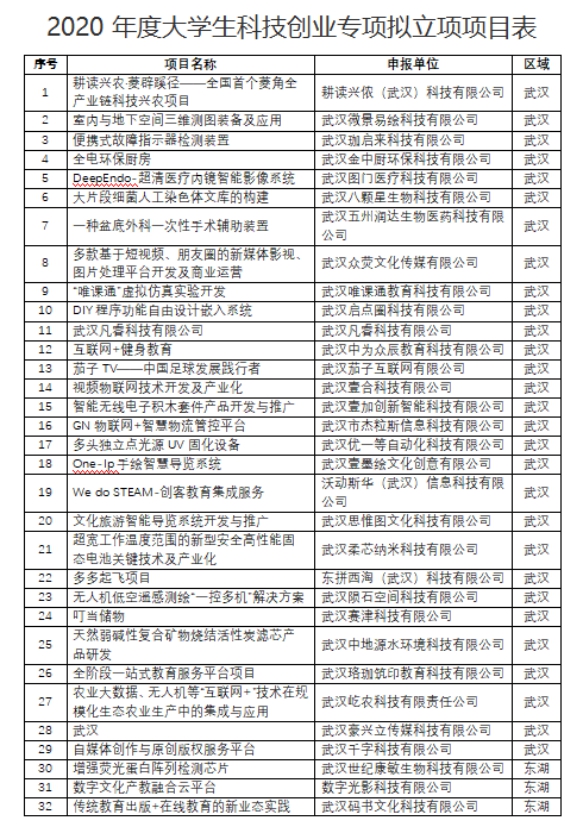 近日,湖北省科学技术厅发布《关于2020年度大学生科技创业专项拟立项项目清单公示的通知》,我校入孵团队2个科技创业项目获省科技创新计划立项。