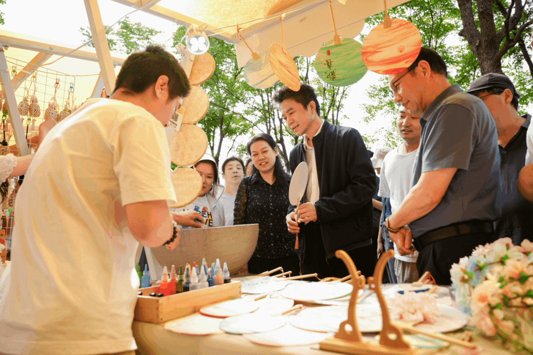 4月29日,省委统战部常务副部长王济民、省职教社专职副主任熊汉华赴沙湖公园“花漾市集”现场指导,并体验漆扇制作、购买文创书签。