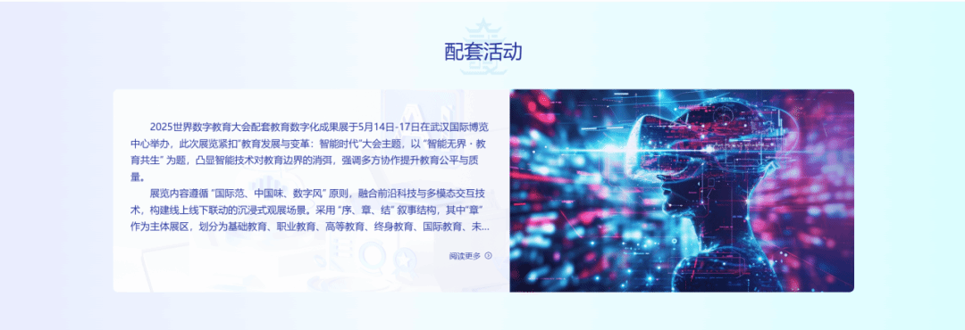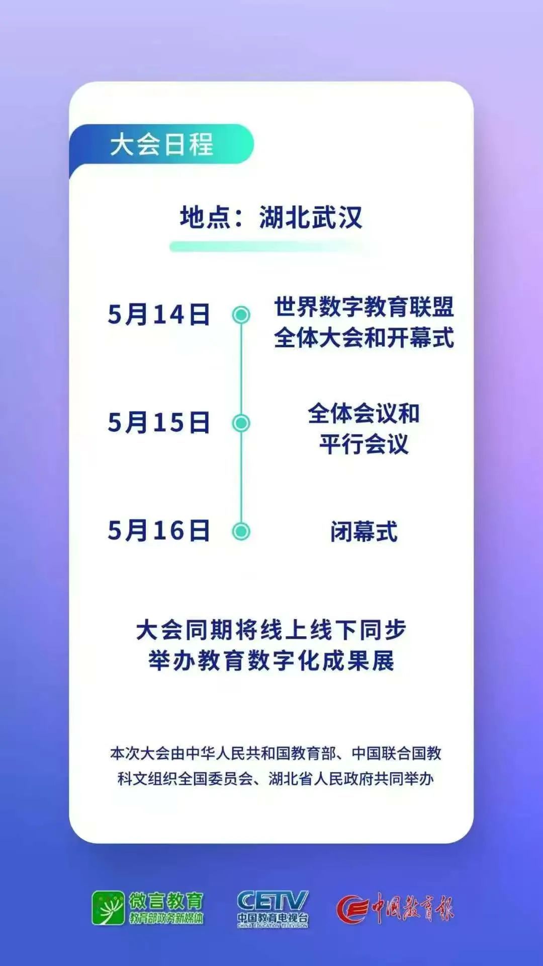 官网显示,5月14日将举行世界数字教育联盟全体大会和开幕式,15日举行全体会议和平行会议,16日举行闭幕式。大会同期将线上线下同步举办教育数字化成果展。