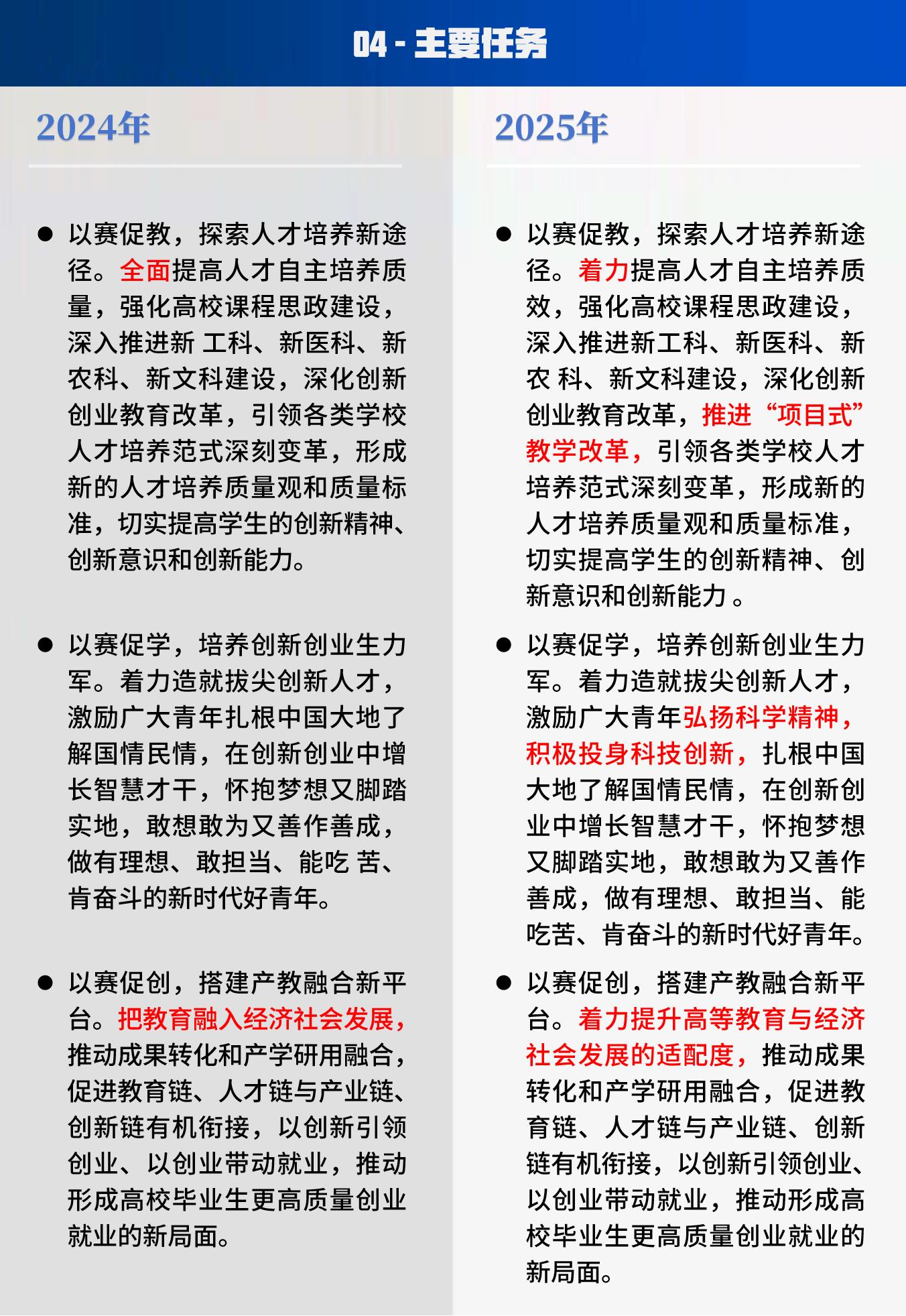《教育部关于举办中国国际大学生创新大赛(2025)的通知》已正式发布,本文将根据本届大赛通知文件,相比去年的变化进行了重点对比。
