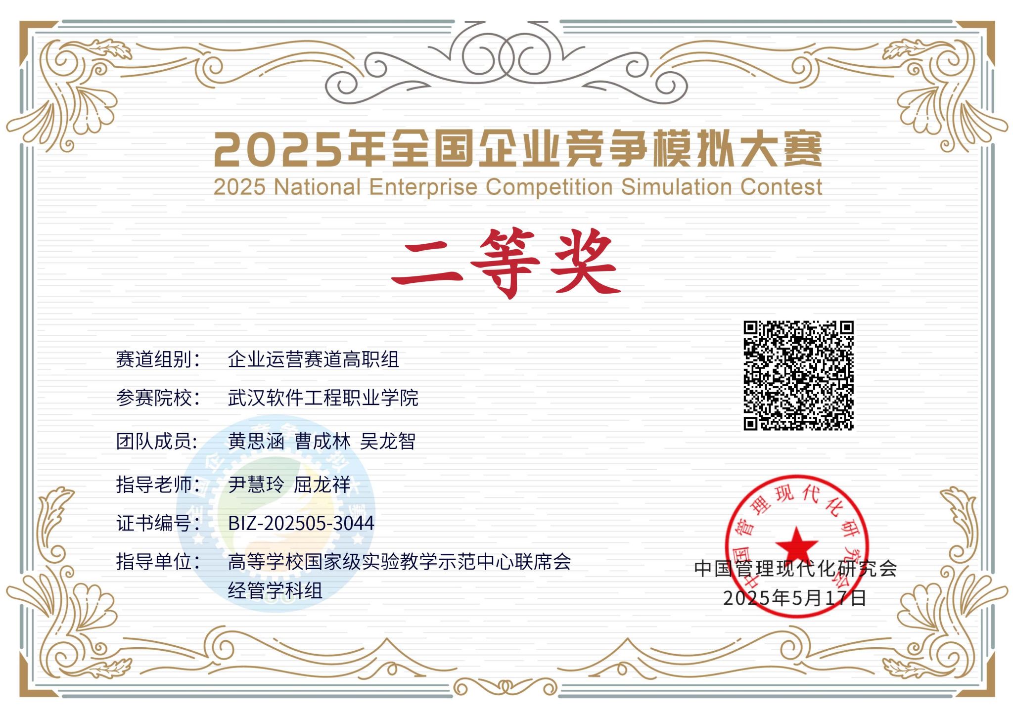 近日,由高等学校国家级实验教学示范中心联席会经管学科组与中国管理现代化研究会决策模拟专业委员会联合主办、西南财经大学承办的2025年全国企业竞争模拟大赛总决赛圆满落幕。我院参赛队伍凭借扎实的专业功底、出色的战略眼光和默契的团队协作,在激烈的角逐中脱颖而出,荣获企业运营赛道高职组全国二等奖,为学校争得了荣誉。