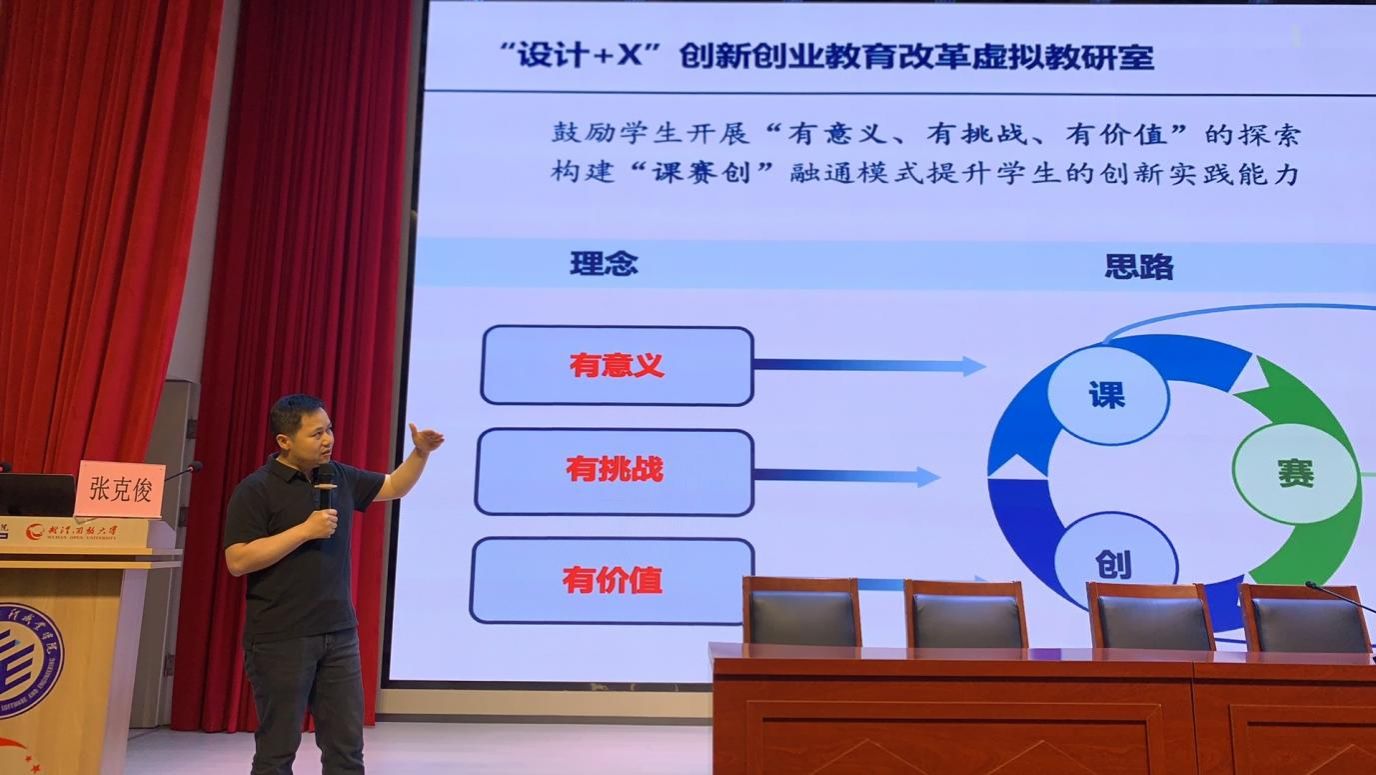活动特邀教育部“设计+X”创新创业教育改革虚拟教研室带头人、国际设计研究院副院长,浙江大学计算机科学与技术学院工业设计系主任张克俊教授以“大模型时代创新教育的机会与挑战”为专题开展授课。张教授凭借丰富的教科研经验,全面剖析大模型技术在教育领域的多元应用。他列举大模型技术在围棋、音乐、汉字、亚运服务等领域的突出成果,展示其为教育、科研和创新创业带来的新机遇。例如,智能学习系统的开发、创新教学工具的应用、传统文化教育的数字化转型,以及虚拟教学助手的设想等。张教授鼓励学生积极参与相关赛事,在实践中提升创新能力。